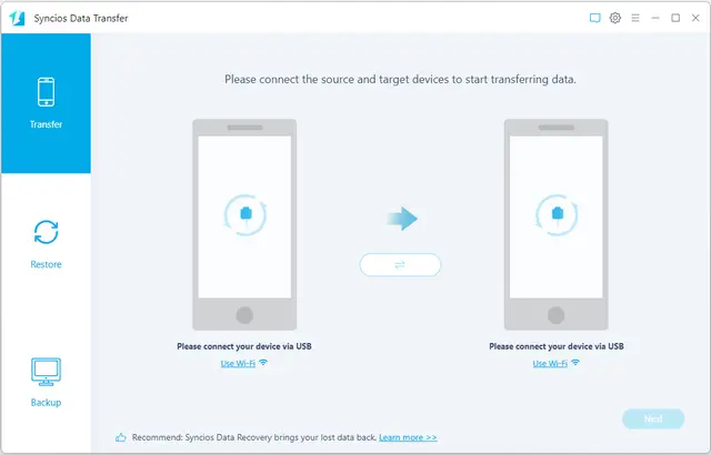 إذا قمت بشراء هاتف جديد ولا تعرف كيف تنقل بياناتك من الهاتف القديم إلى الجديد، فإن SynciOS Data Transfer يوفر حلاً بسيطًا وسريعًا. كل ما عليك فعله هو توصيل كلا الهاتفين بالكمبيوتر، ومن ثم يمكنك نقل البيانات بينهما بنقرة واحدة فقط. هذه الميزة مفيدة بشكل خاص إذا كنت تستخدم هاتف أندرويد وقررت الانتقال إلى هاتف آبل، أو العكس.