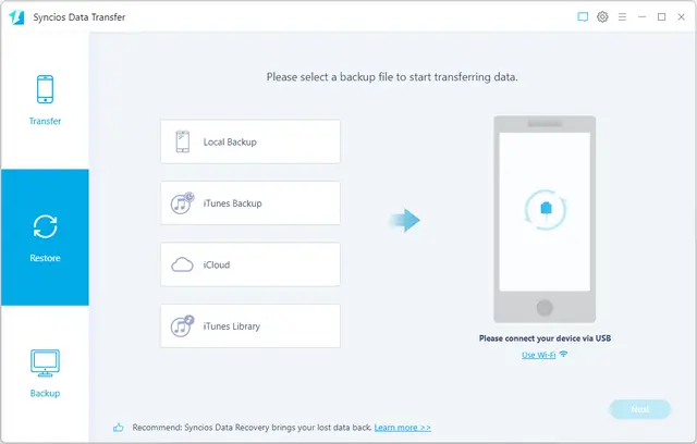 من الميزات الرائعة الأخرى في برنامج SynciOS Data Transfer هو دعمه لإدارة ملفات النسخ الاحتياطي الخاصة ببرنامج iTunes. يمكنك من خلاله استعادة النسخ الاحتياطية بسهولة، ونقل جهات الاتصال، والرسائل النصية، والصور، والفيديوهات، وغيرها من الملفات إلى أي هاتف محمول مدعوم. هذا يجعل البرنامج أداة متكاملة لإدارة البيانات بين مختلف الأجهزة المحمولة، بغض النظر عن نظام التشغيل.